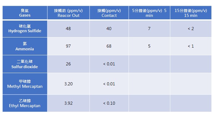 - 右表是HUANTEC與常見的臭氧進行接觸試驗,結果數據證實HUANTEC確可中和臭味,非一般芳香劑以香味遮蓋。